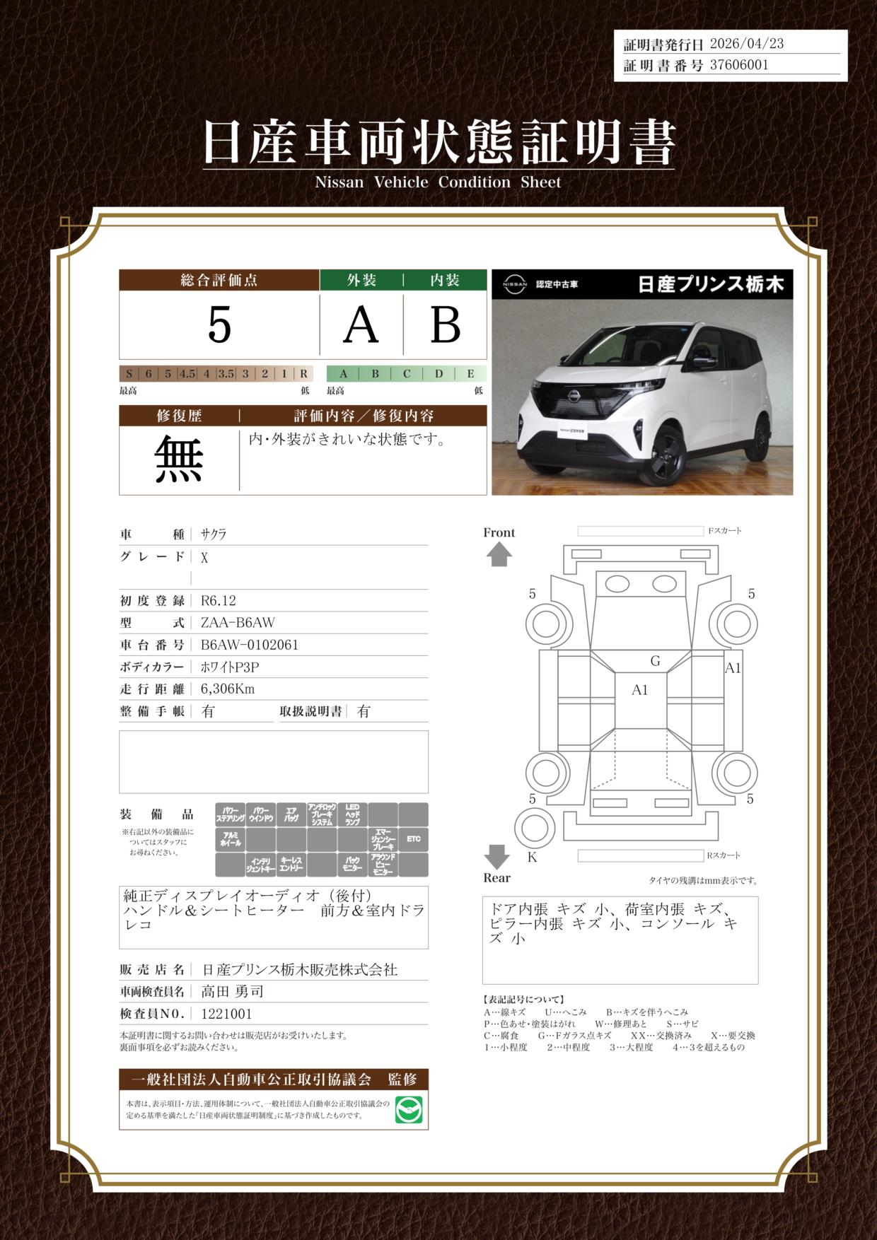 「車両状態証明書」は、査定協会監修のプロの検査員が公正かつ確かな基準で検査した”安心の証”です。