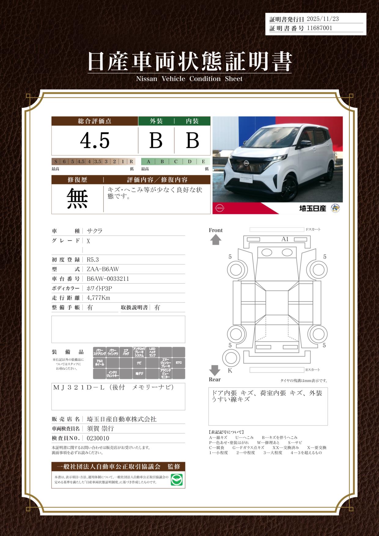 評価機関 : 日産車両状態証明