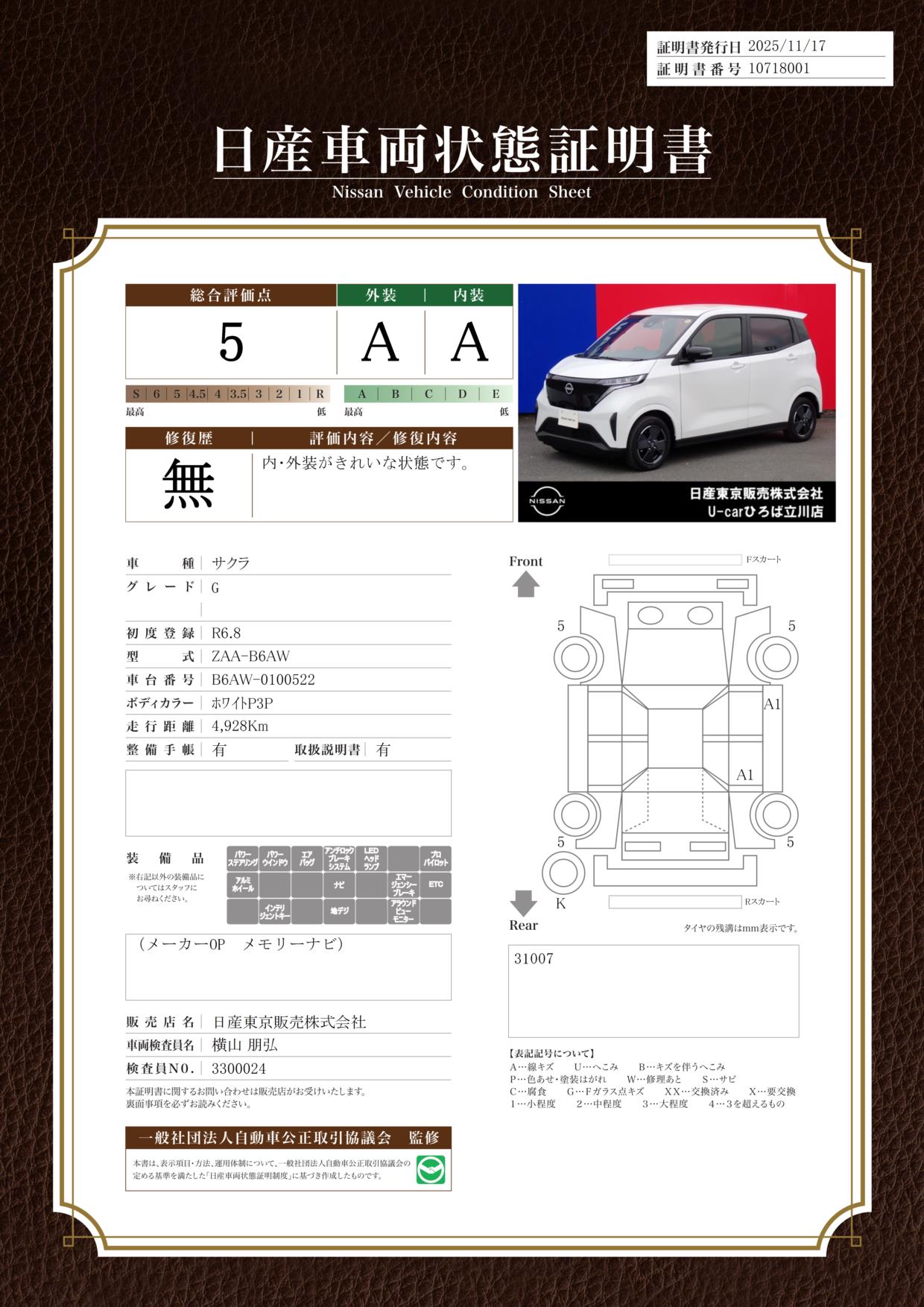 評価機関 : 日産車両状態証明