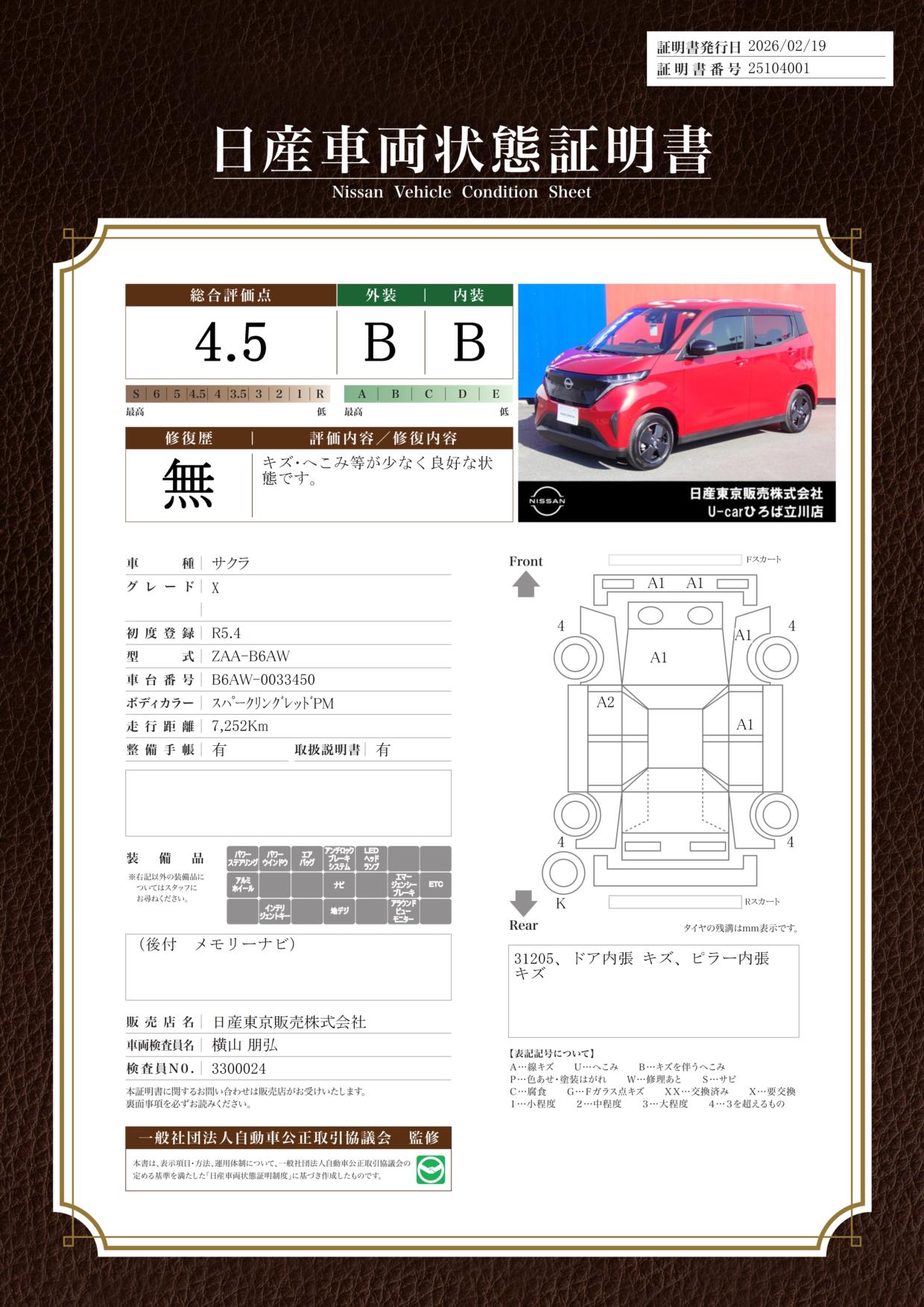 サクラ X 社用車 純正メモリーナビ 電気自動車