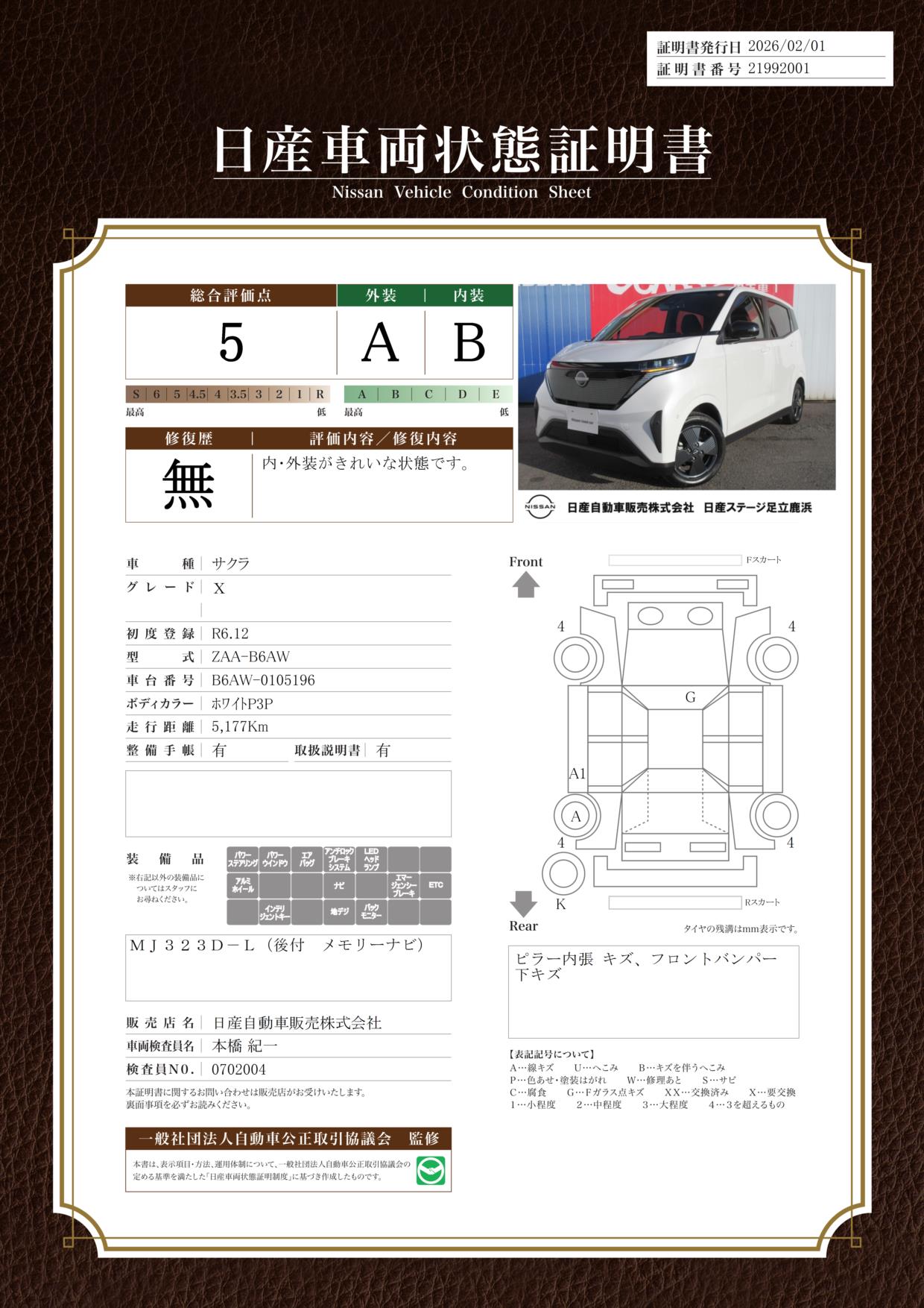 「車両状態証明書」は、査定協会監修のプロの検査員が公正かつ確かな基準で検査した”安心の証”です。