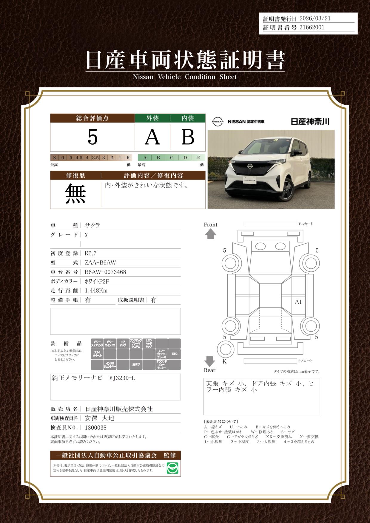 「車両状態証明書」は、査定協会監修のプロの検査員が公正かつ確かな基準で検査した”安心の証”です。