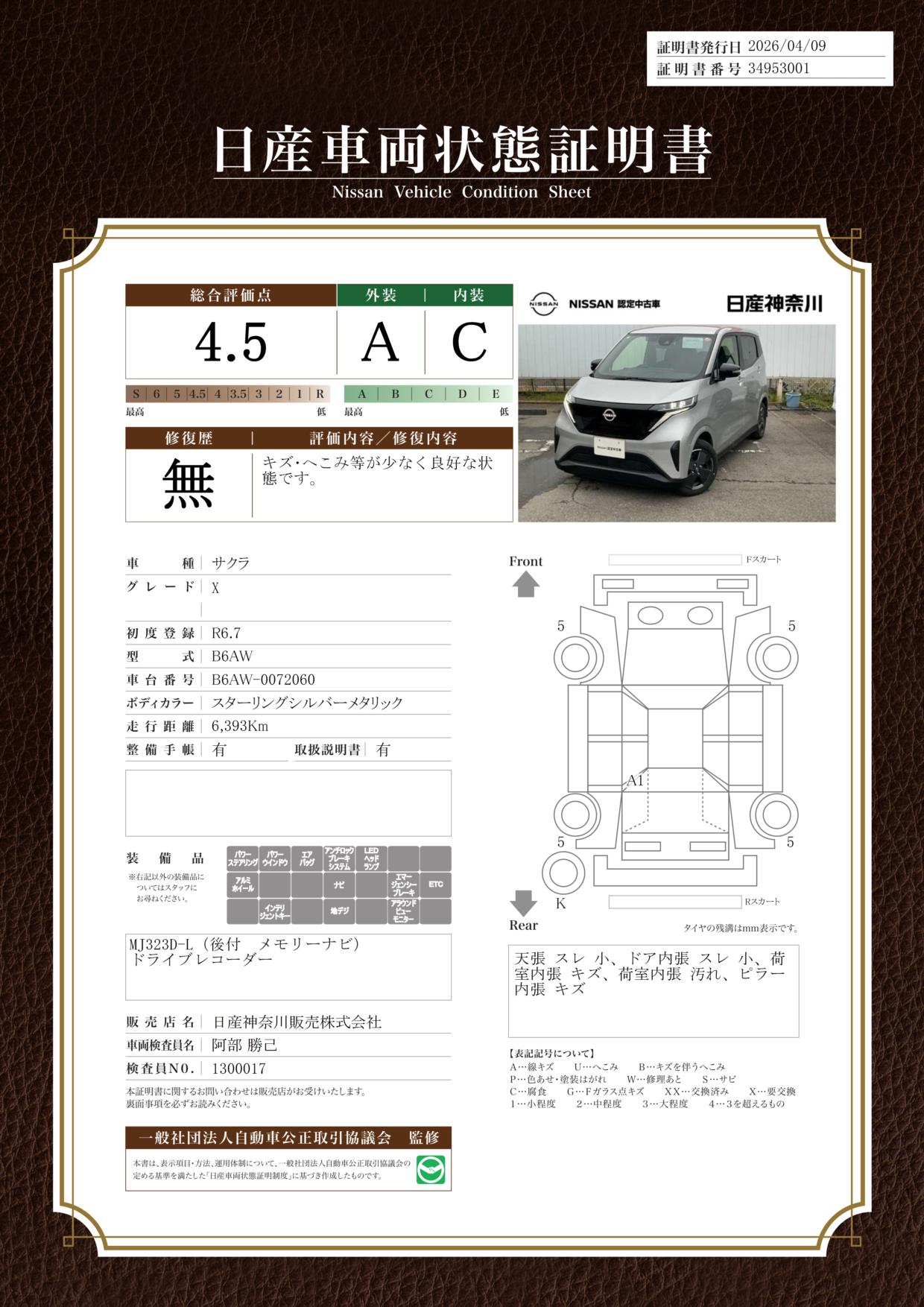 「車両状態証明書」は、査定協会監修のプロの検査員が公正かつ確かな基準で検査した”安心の証”です。