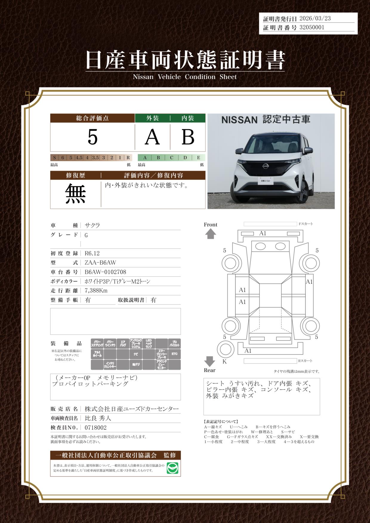 「車両状態証明書」は、査定協会監修のプロの検査員が公正かつ確かな基準で検査した”安心の証”です。