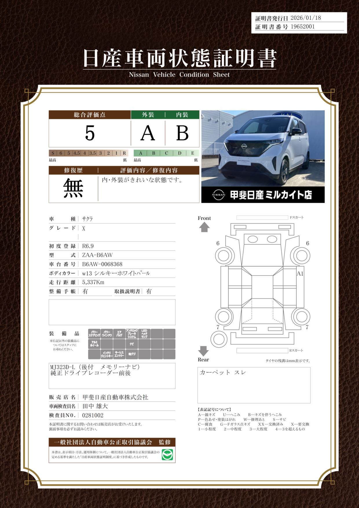 現状括弧書き内の年月まで車検有効期限が残っていますが、ご成約時に新しく車検を取り直します。なお取り直しの費用は車両価格に含まれています。
