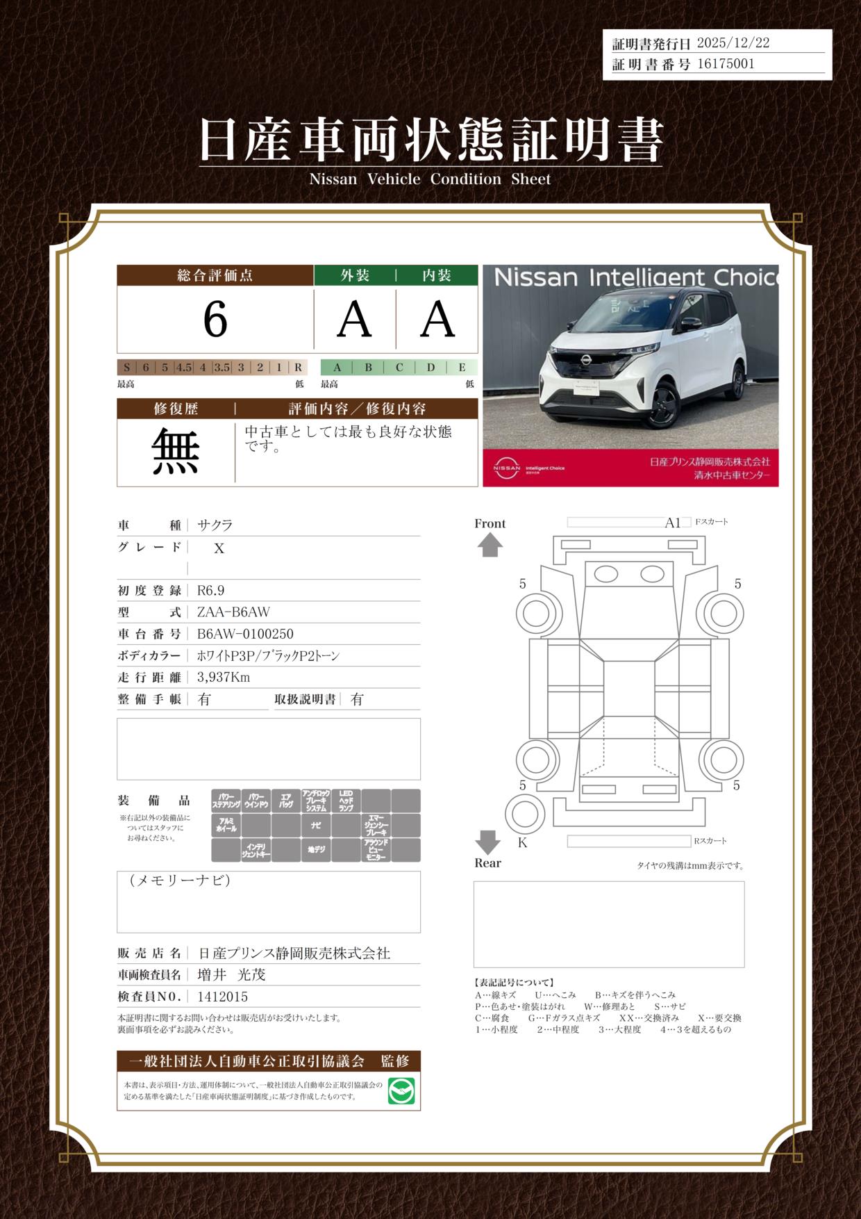 「車両状態証明書」は、査定協会監修のプロの検査員が公正かつ確かな基準で検査した”安心の証”です。