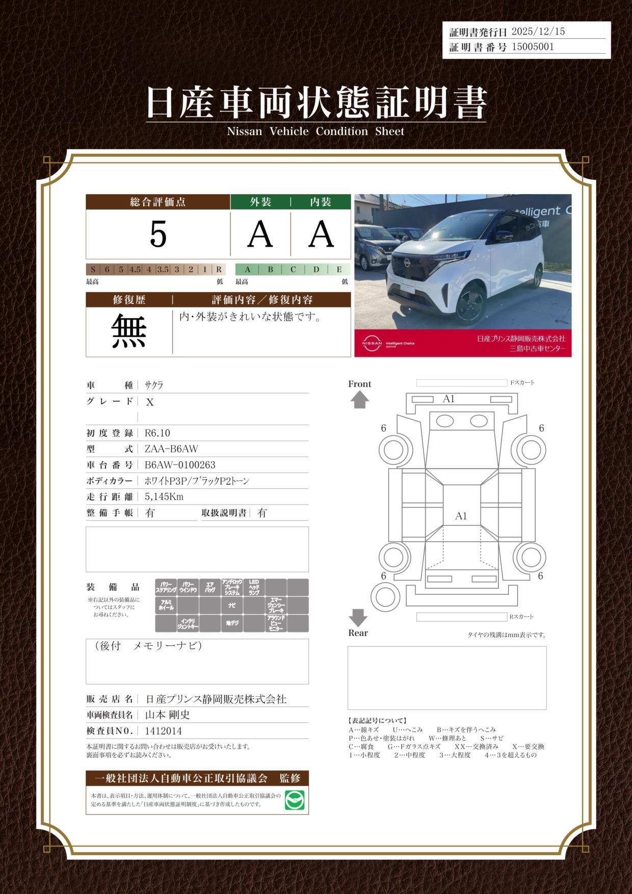 日産サクラ入荷しました★前後ドライブレコーダー★インテリジェントキー★メモリーナビ★アラウンドビューモニター★