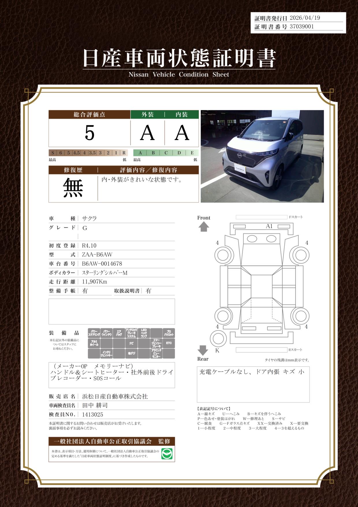 「車両状態証明書」は、査定協会監修のプロの検査員が公正かつ確かな基準で検査した”安心の証”です。