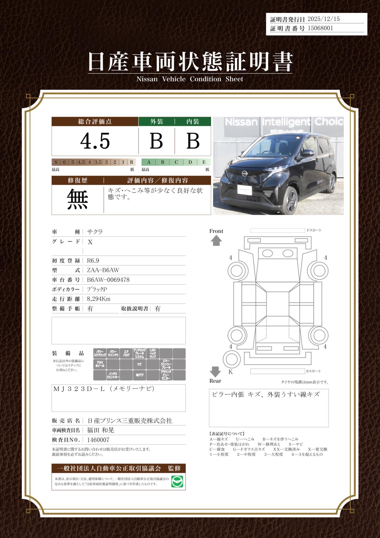 サクラ X 当社社有車 純正ナビ・全周囲カメラ付き車