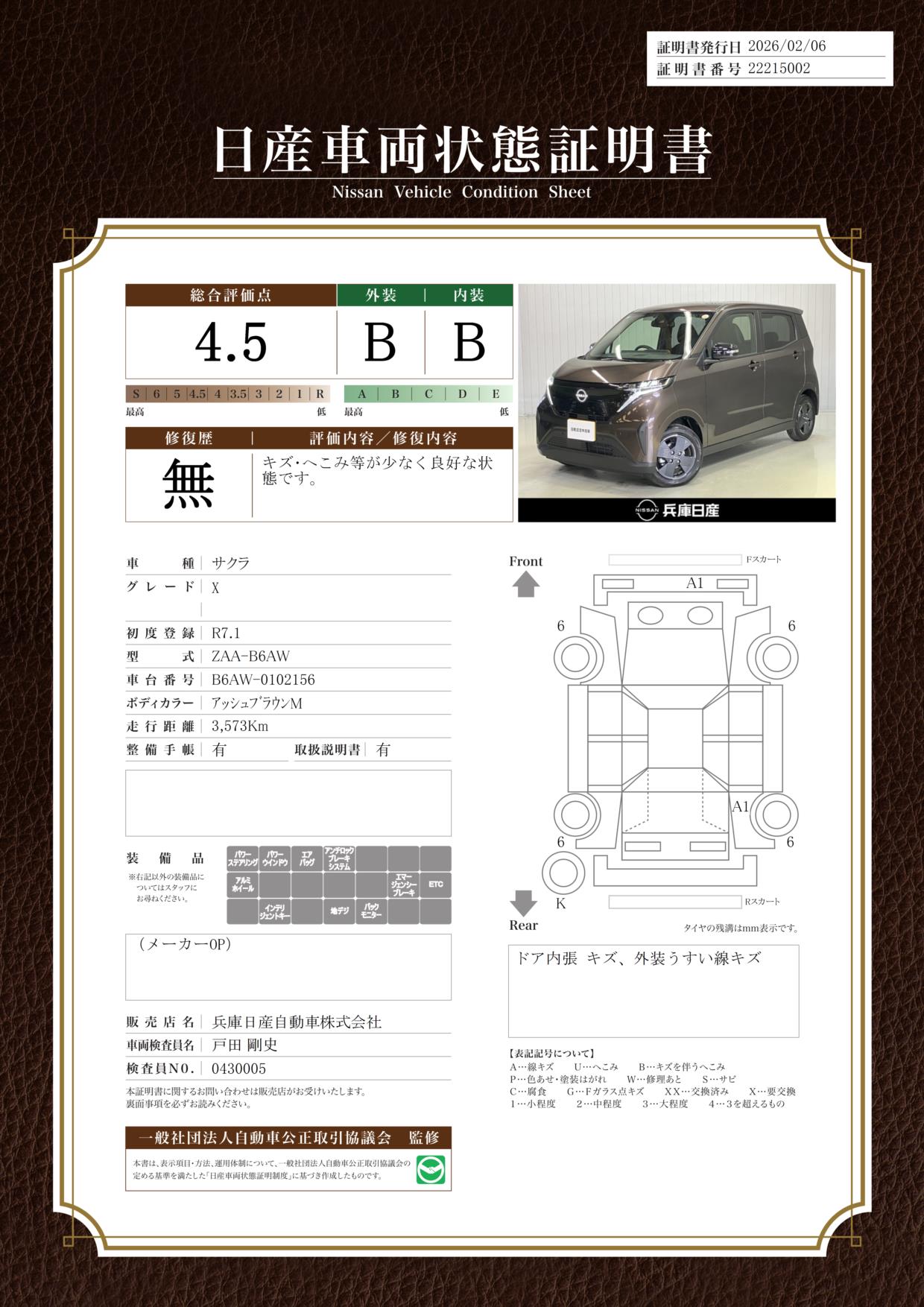 現状括弧書き内の年月まで車検有効期限が残っていますが、ご成約時に新しく車検を取り直します。なお取り直しの費用は車両価格に含まれています。