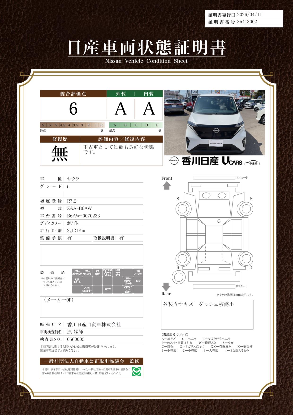 「車両状態証明書」は、査定協会監修のプロの検査員が公正かつ確かな基準で検査した”安心の証”です。
