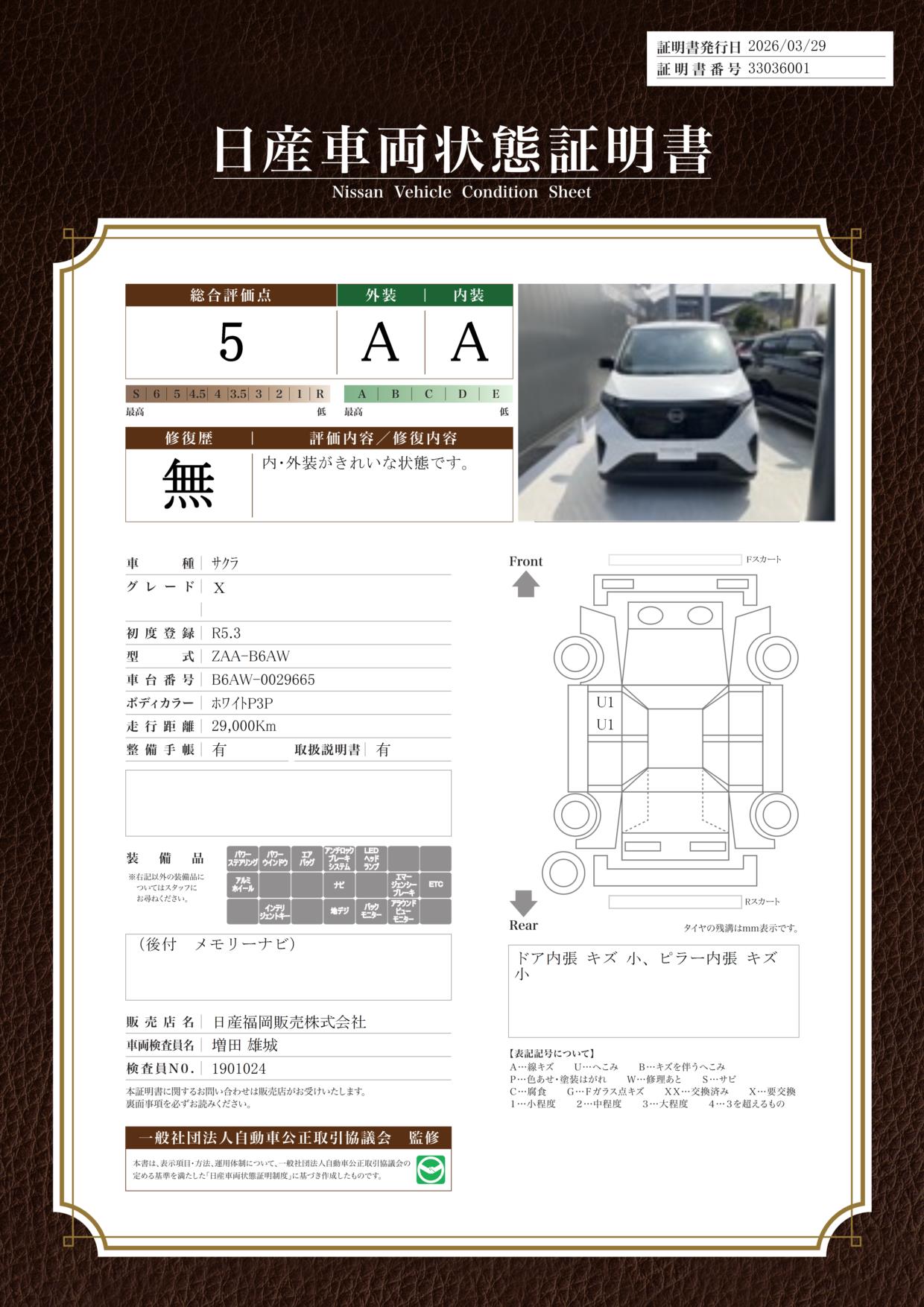 「車両状態証明書」は、査定協会監修のプロの検査員が公正かつ確かな基準で検査した”安心の証”です。