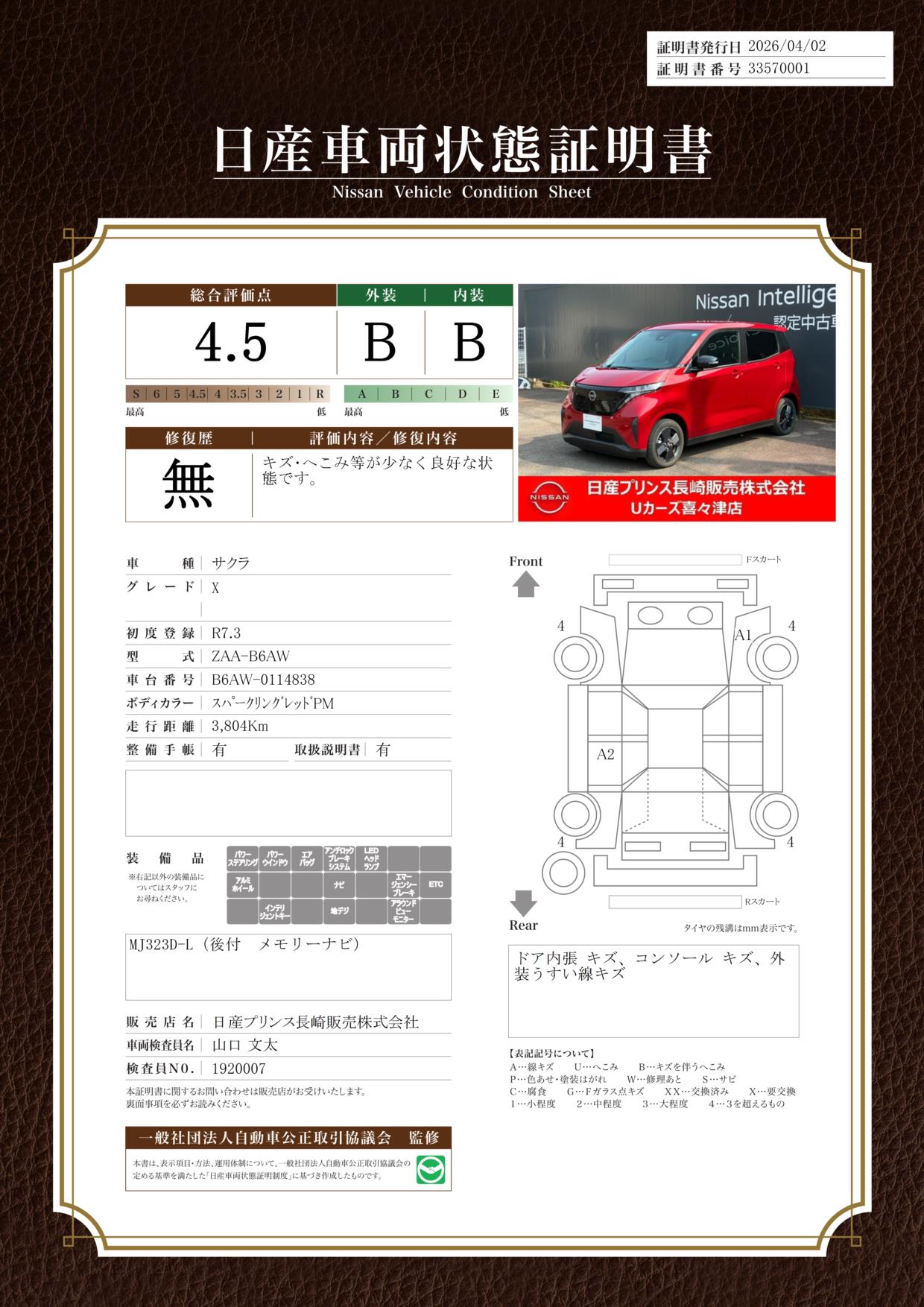 「車両状態証明書」は、査定協会監修のプロの検査員が公正かつ確かな基準で検査した”安心の証”です。