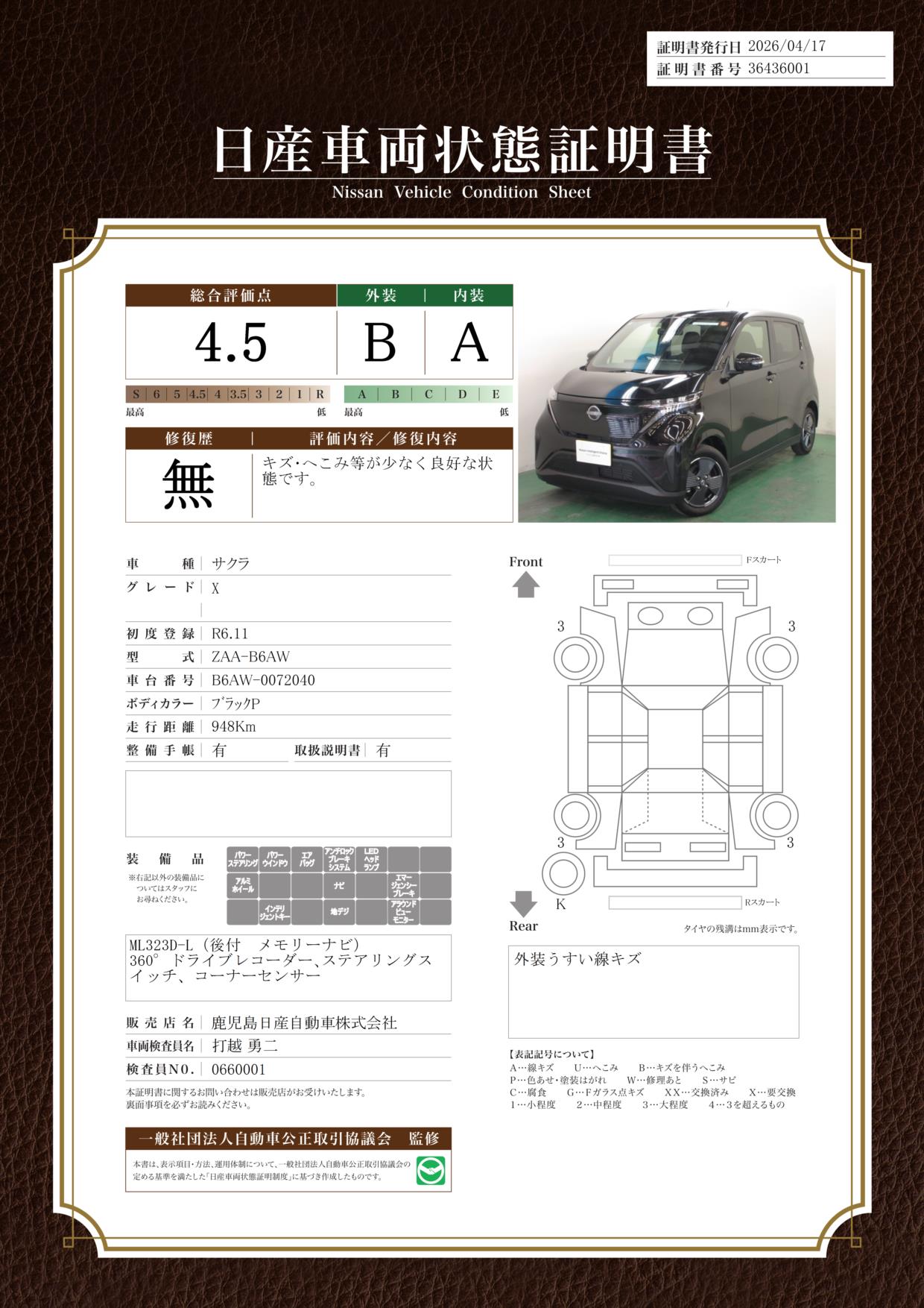 「車両状態証明書」は、査定協会監修のプロの検査員が公正かつ確かな基準で検査した”安心の証”です。