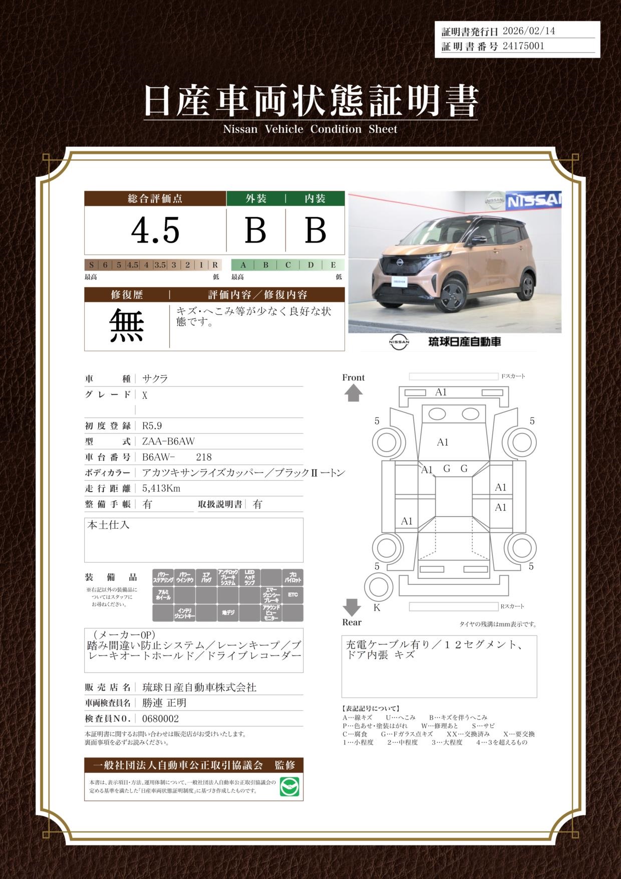 「車両状態証明書」は、査定協会監修のプロの検査員が公正かつ確かな基準で検査した”安心の証”です。