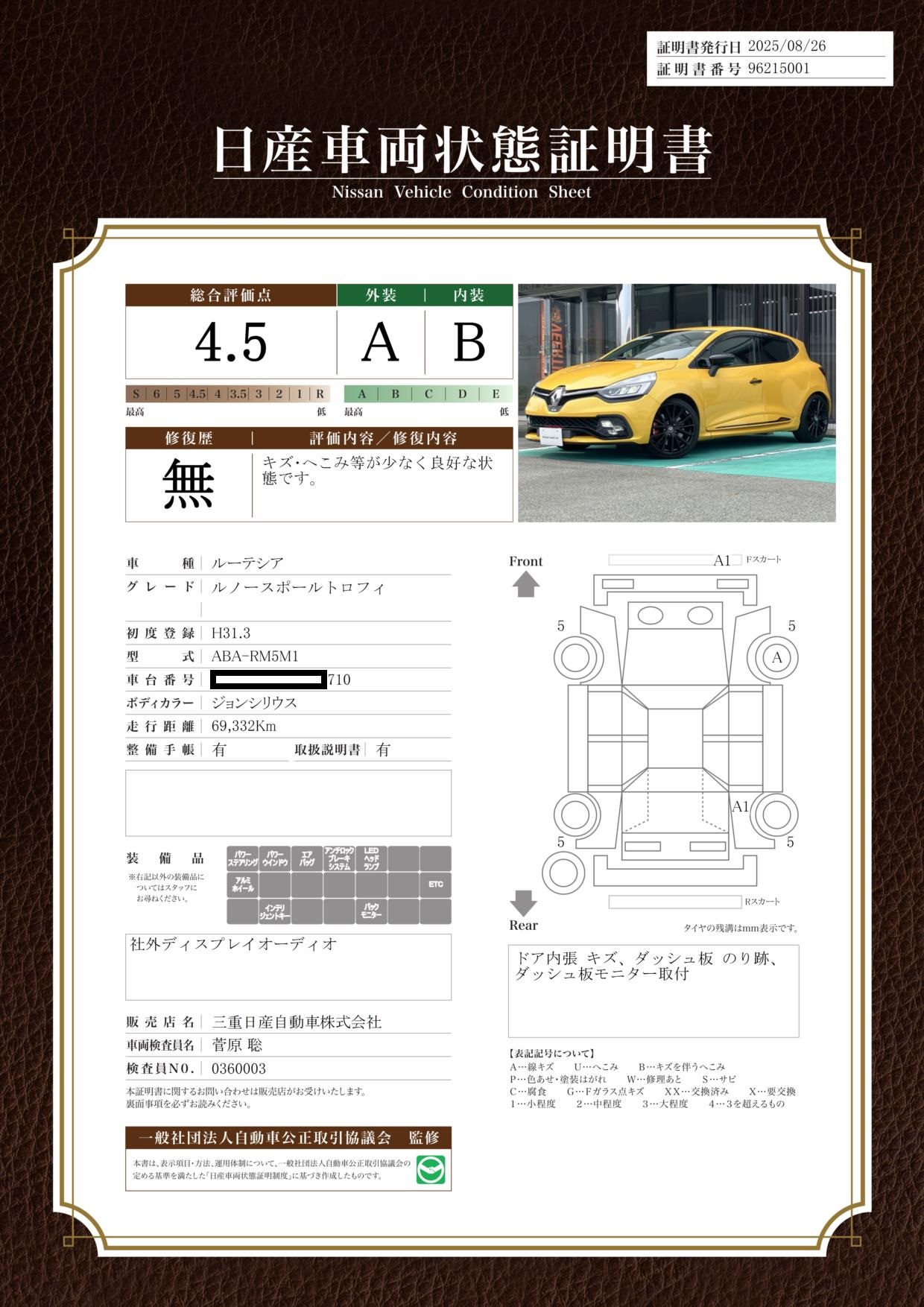 評価機関 : 日産車両状態証明