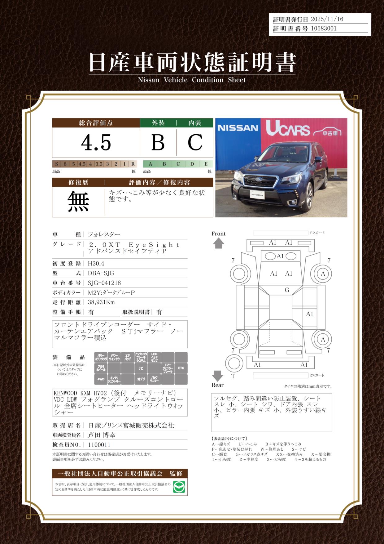 フォレスター 2000cc 2.0XT アイサイト 4WD 2.0XT EyeSight