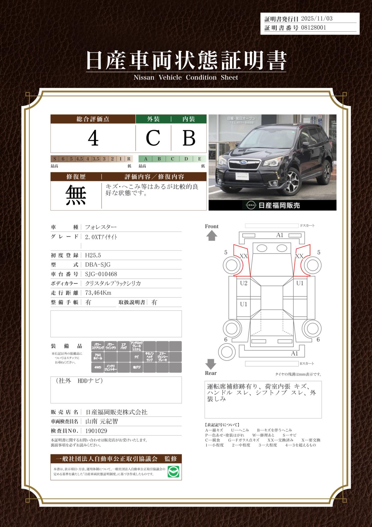 フォレスター 2000cc 2.0XT アイサイト 4WD ワンオーナー HDDナビ ドライブレコーダ