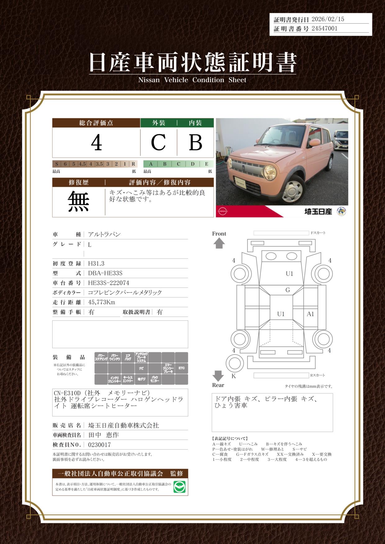 現状車検切れの状態ですが、ご成約時に新しく車検を実施します。車検費用は車両価格に含まれています。