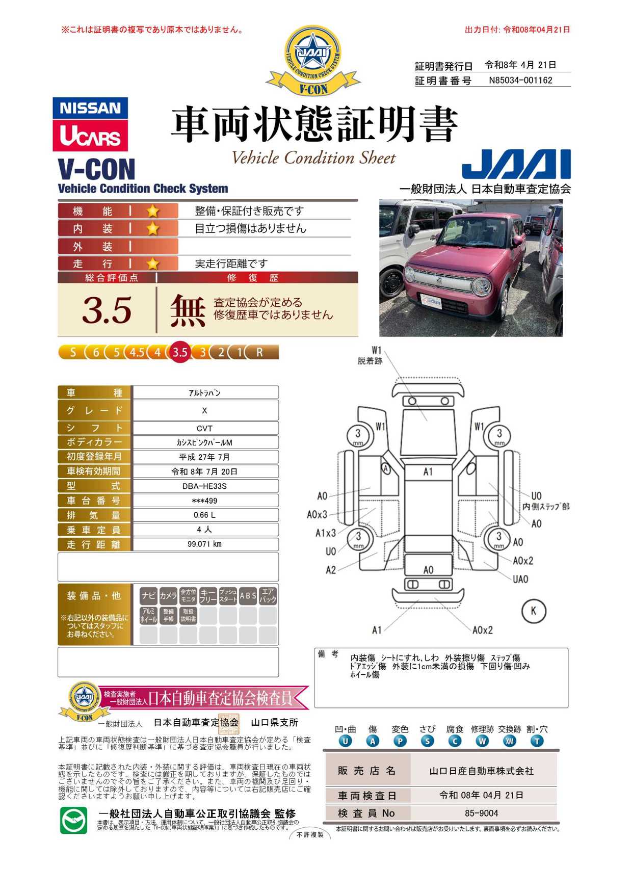 現状括弧書き内の年月まで車検有効期限が残っていますが、ご成約時に新しく車検を取り直します。なお取り直しの費用は車両価格に含まれています。