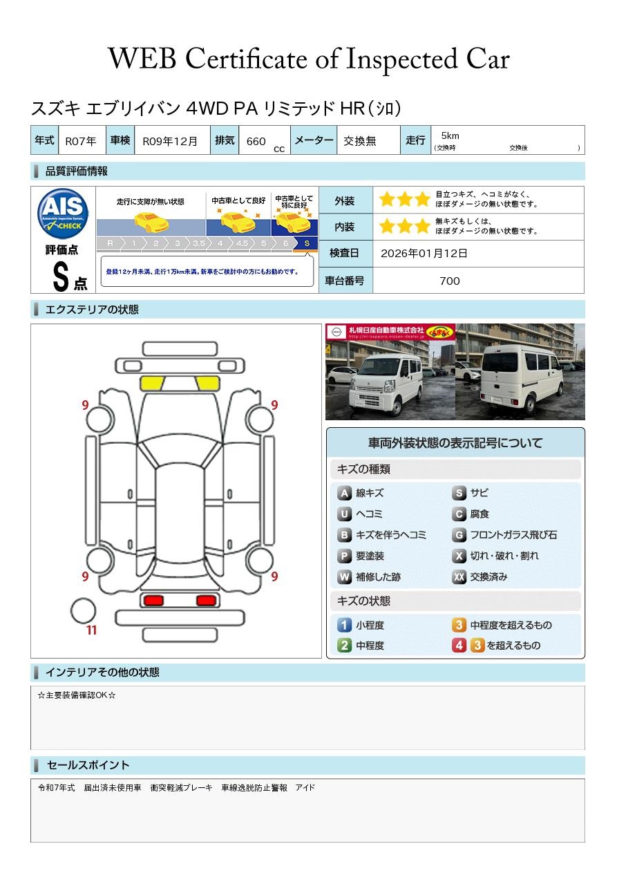 エブリイ 660cc 660 PA リミテッド ハイルーフ 4WD 令和7年式 届出済未使用車