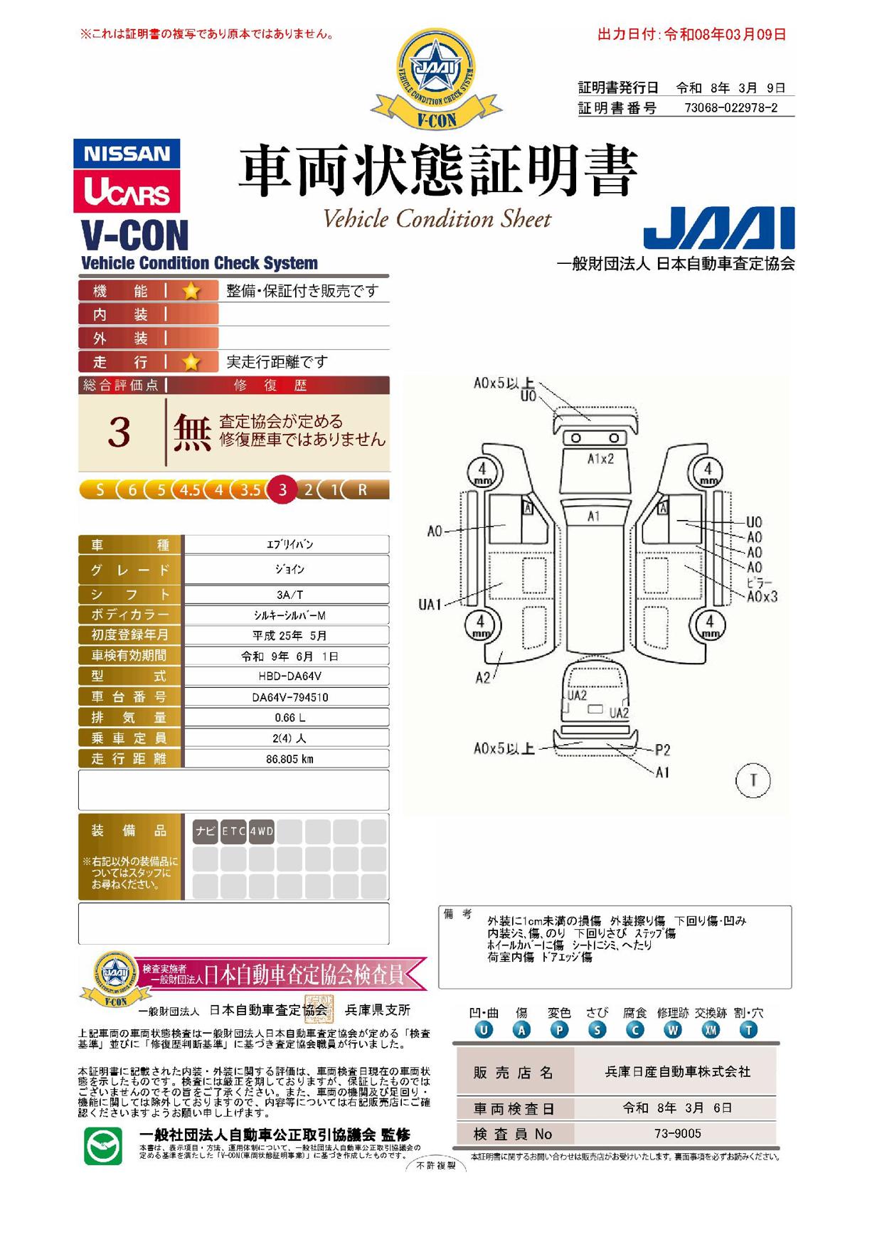 現状括弧書き内の年月まで車検有効期限が残っていますが、ご成約時に新しく車検を取り直します。なお取り直しの費用は車両価格に含まれています。