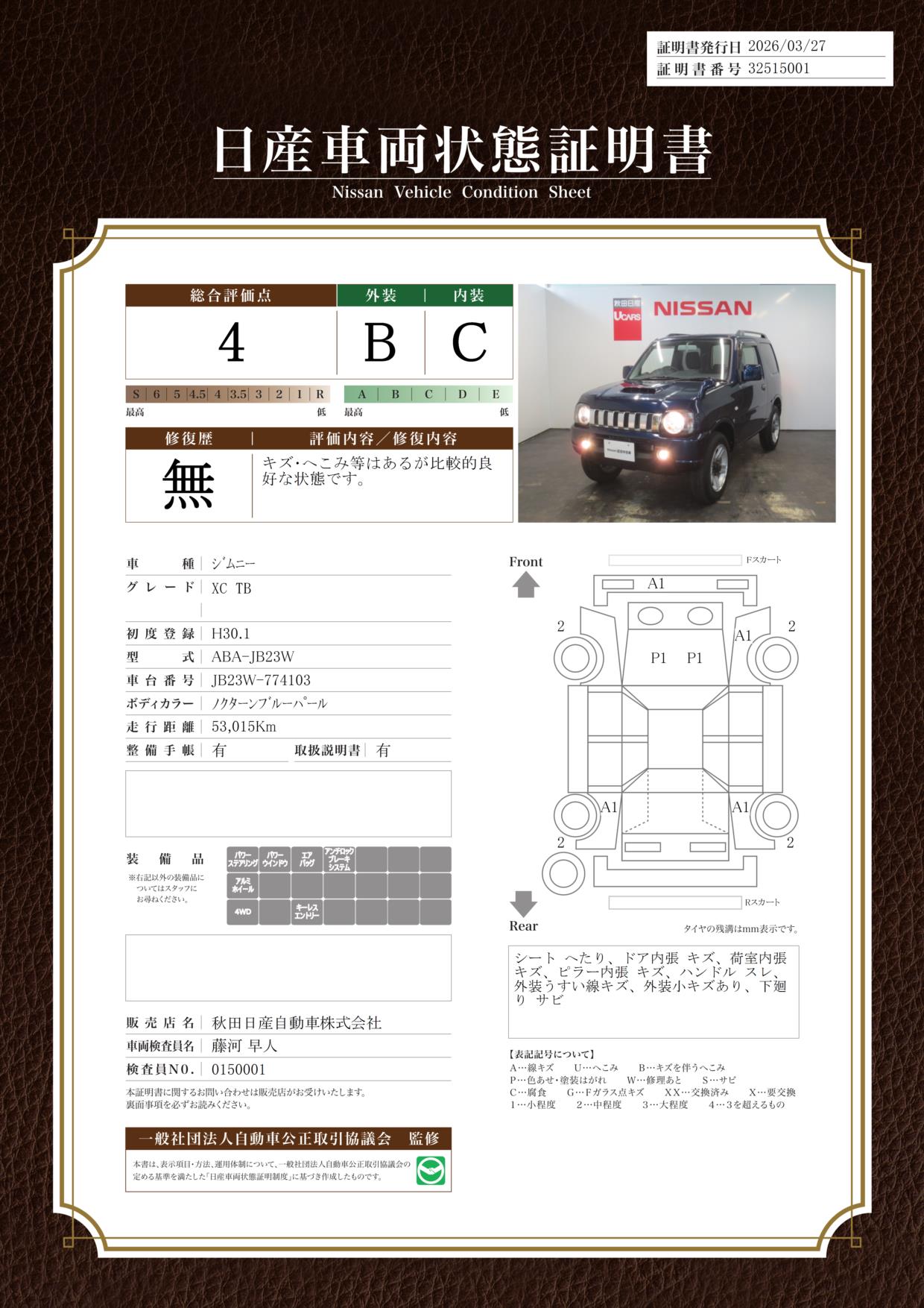 現状括弧書き内の年月まで車検有効期限が残っていますが、ご成約時に新しく車検を取り直します。なお取り直しの費用は車両価格に含まれています。