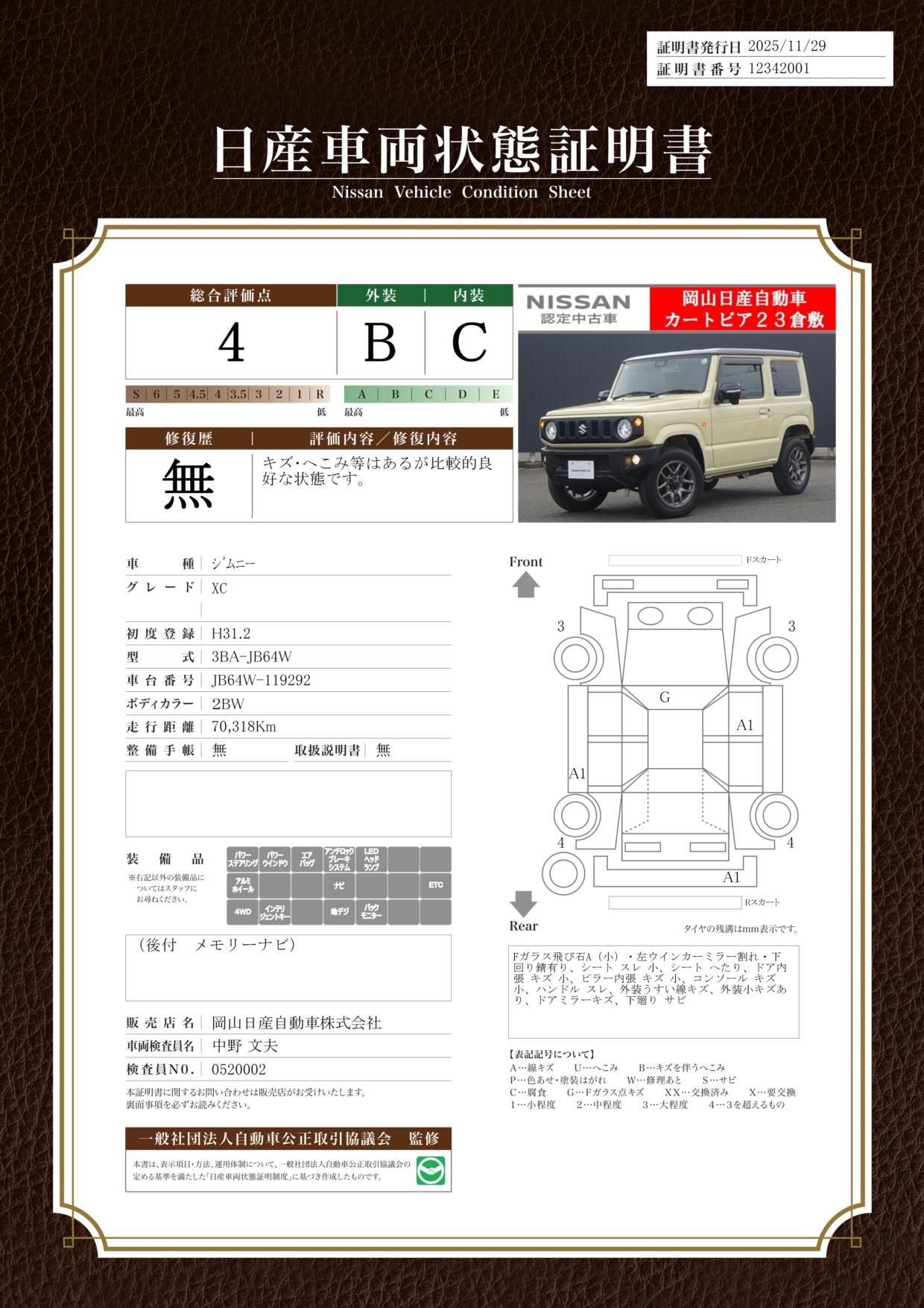 ジムニー 660cc 660 XC 4WD メモリーナビ&バックモニター&ドラレコ