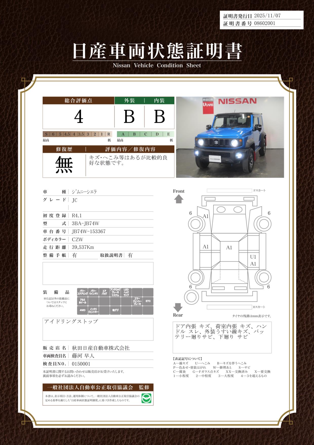 現状括弧書き内の年月まで車検有効期限が残っていますが、ご成約時に新しく車検を取り直します。なお取り直しの費用は車両価格に含まれています。