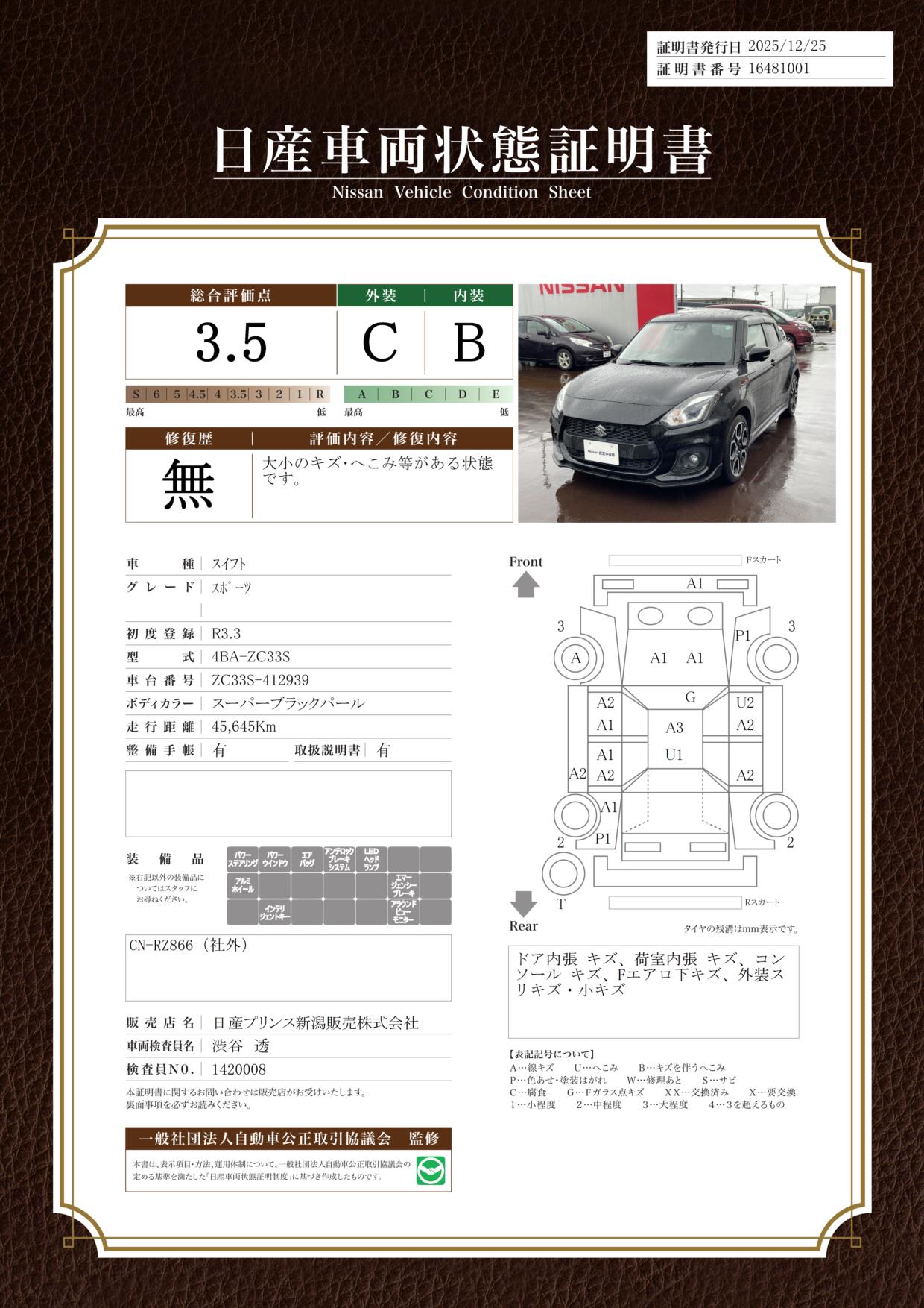 評価機関 : 日産車両状態証明