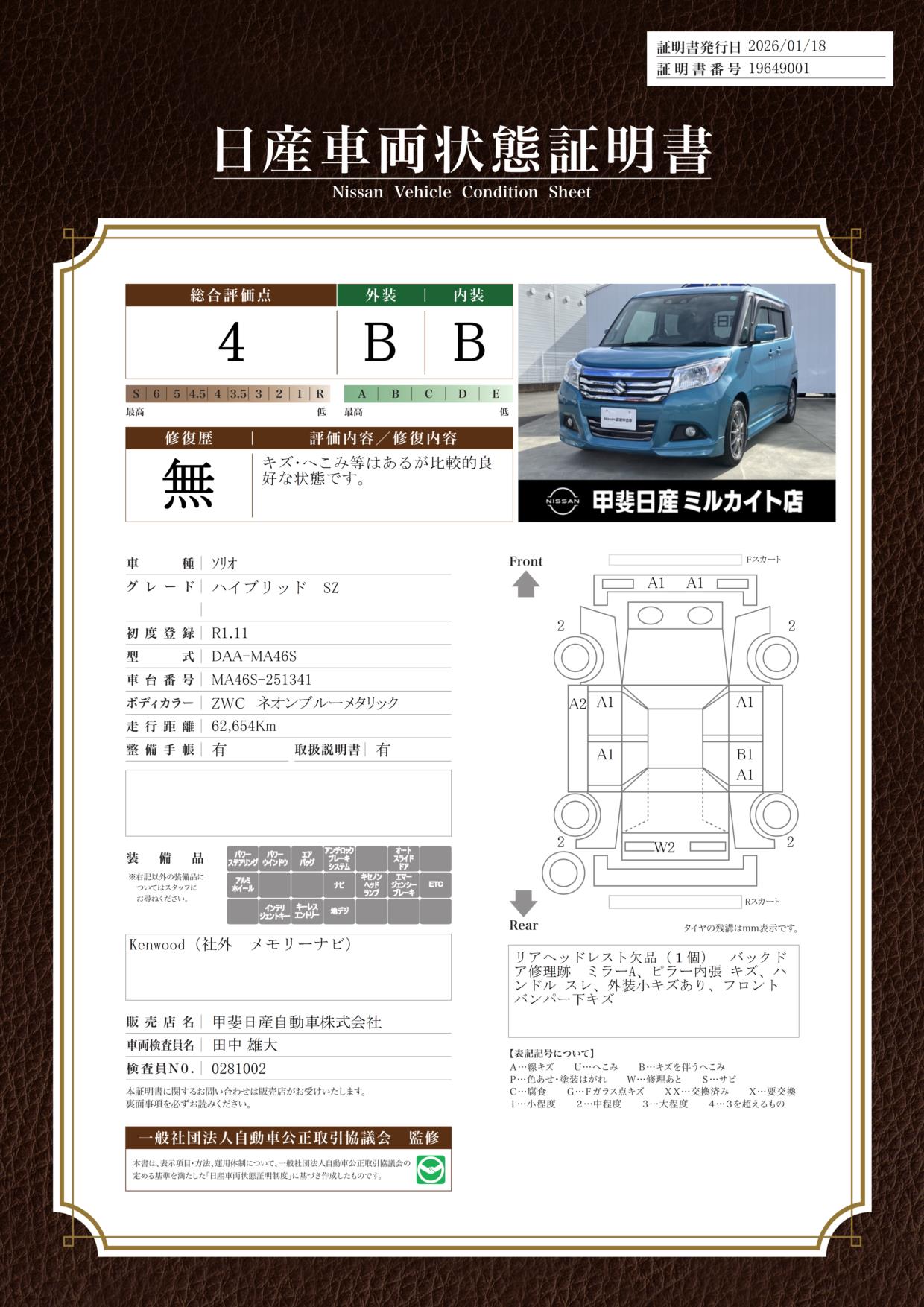 現状括弧書き内の年月まで車検有効期限が残っていますが、ご成約時に新しく車検を取り直します。なお取り直しの費用は車両価格に含まれています。
