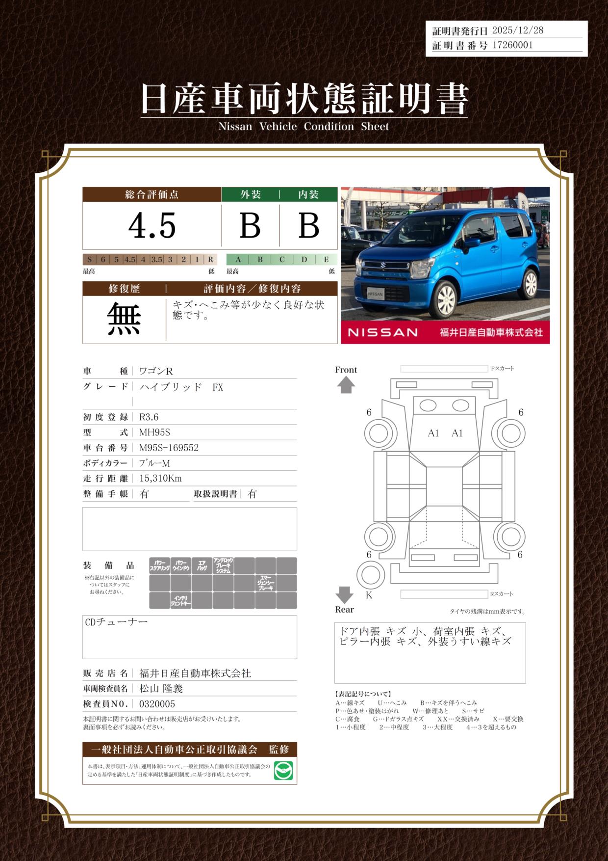 現状括弧書き内の年月まで車検有効期限が残っていますが、ご成約時に新しく車検を取り直します。なお取り直しの費用は車両価格に含まれています。
