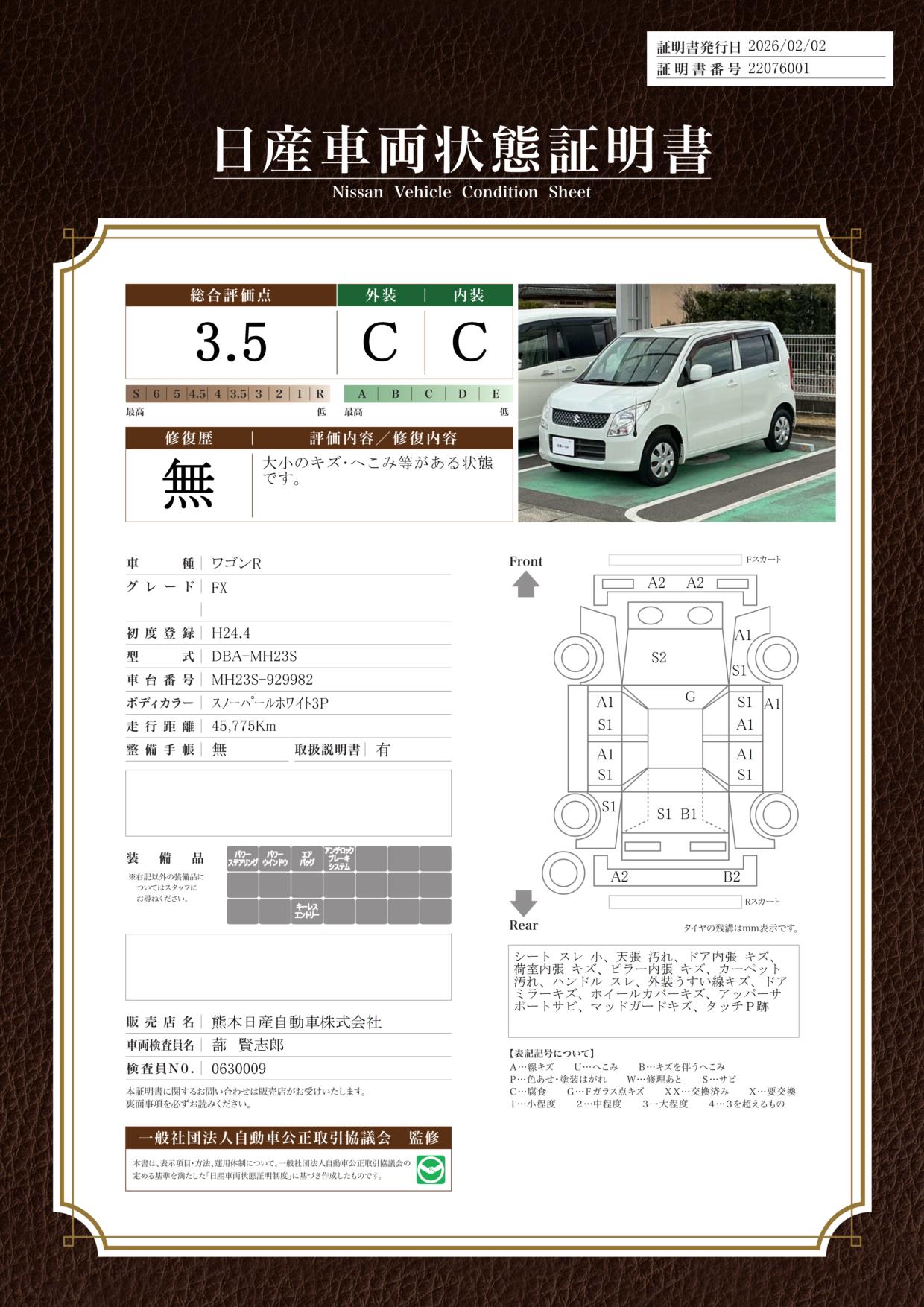 現状括弧書き内の年月まで車検有効期限が残っていますが、ご成約時に新しく車検を取り直します。なお取り直しの費用は車両価格に含まれています。