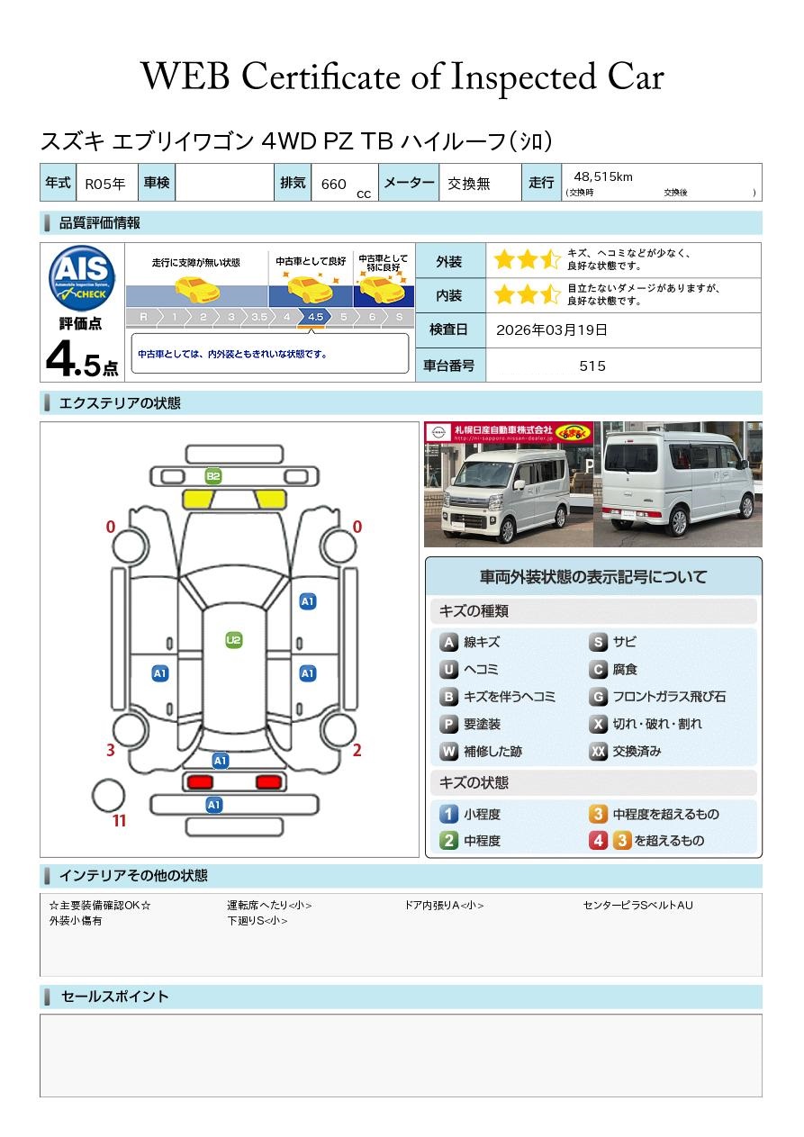 現状括弧書き内の年月まで車検有効期限が残っていますが、ご成約時に新しく車検を取り直します。なお取り直しの費用は車両価格に含まれています。