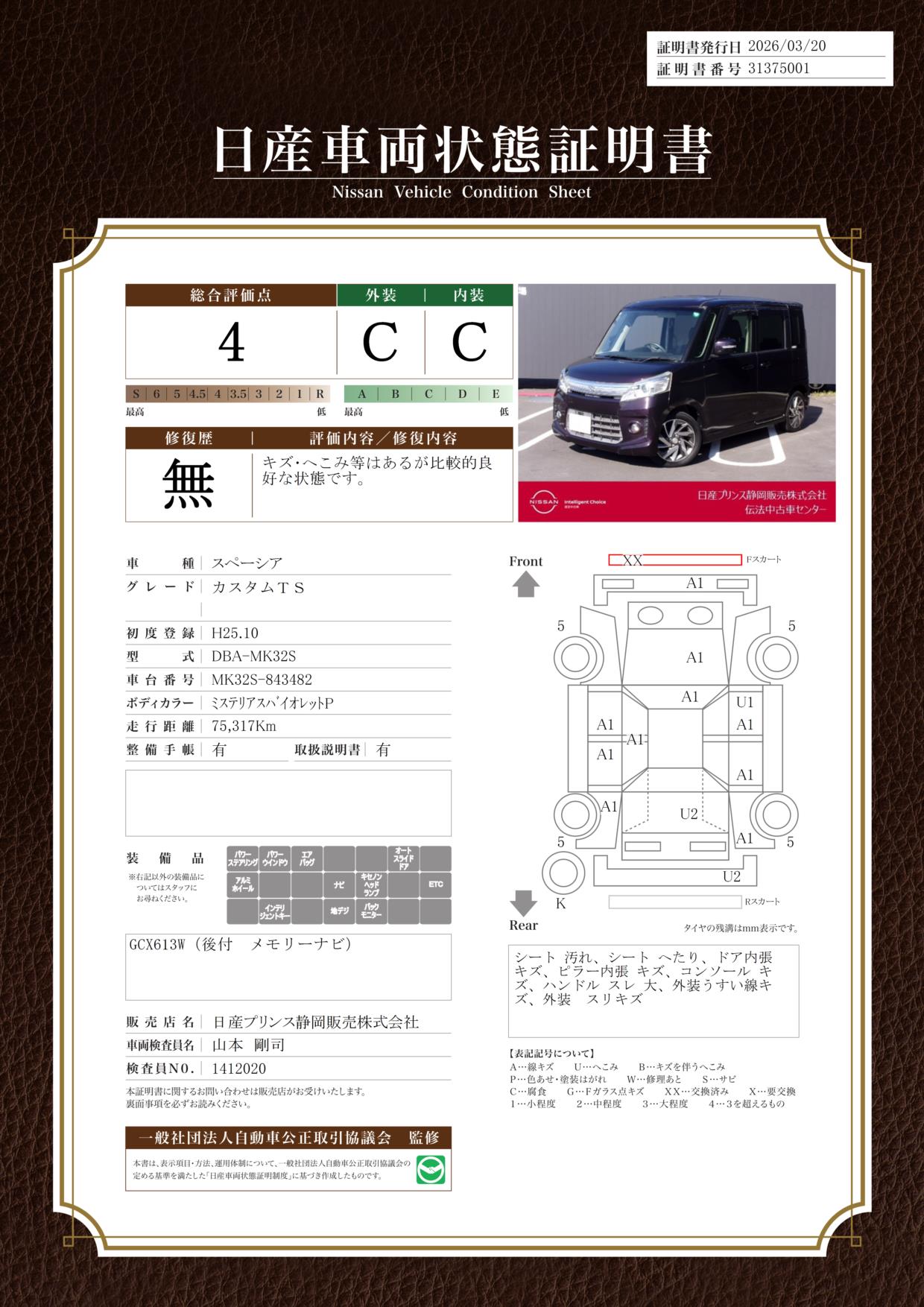 現状括弧書き内の年月まで車検有効期限が残っていますが、ご成約時に新しく車検を取り直します。なお取り直しの費用は車両価格に含まれています。
