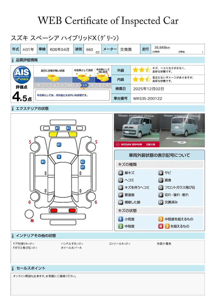 スペーシア 660cc 660 ハイブリッド X 衝突軽減ブレーキ 後方コーナーセンサー