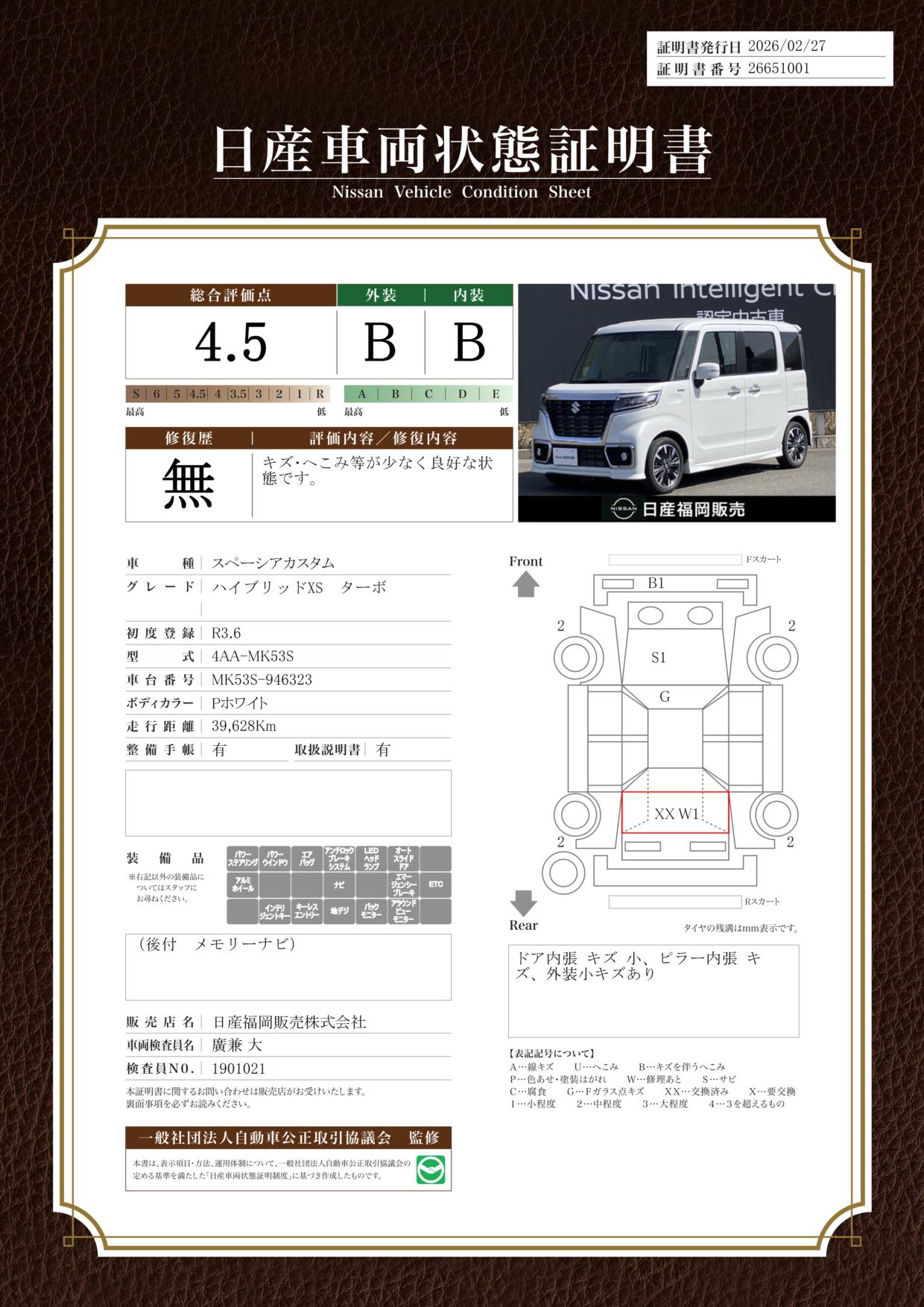 現状括弧書き内の年月まで車検有効期限が残っていますが、ご成約時に新しく車検を取り直します。なお取り直しの費用は車両価格に含まれています。