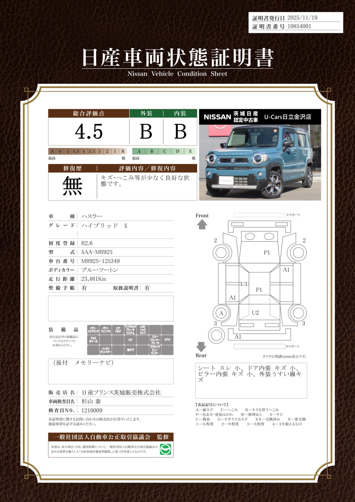 評価機関 : 日産車両状態証明