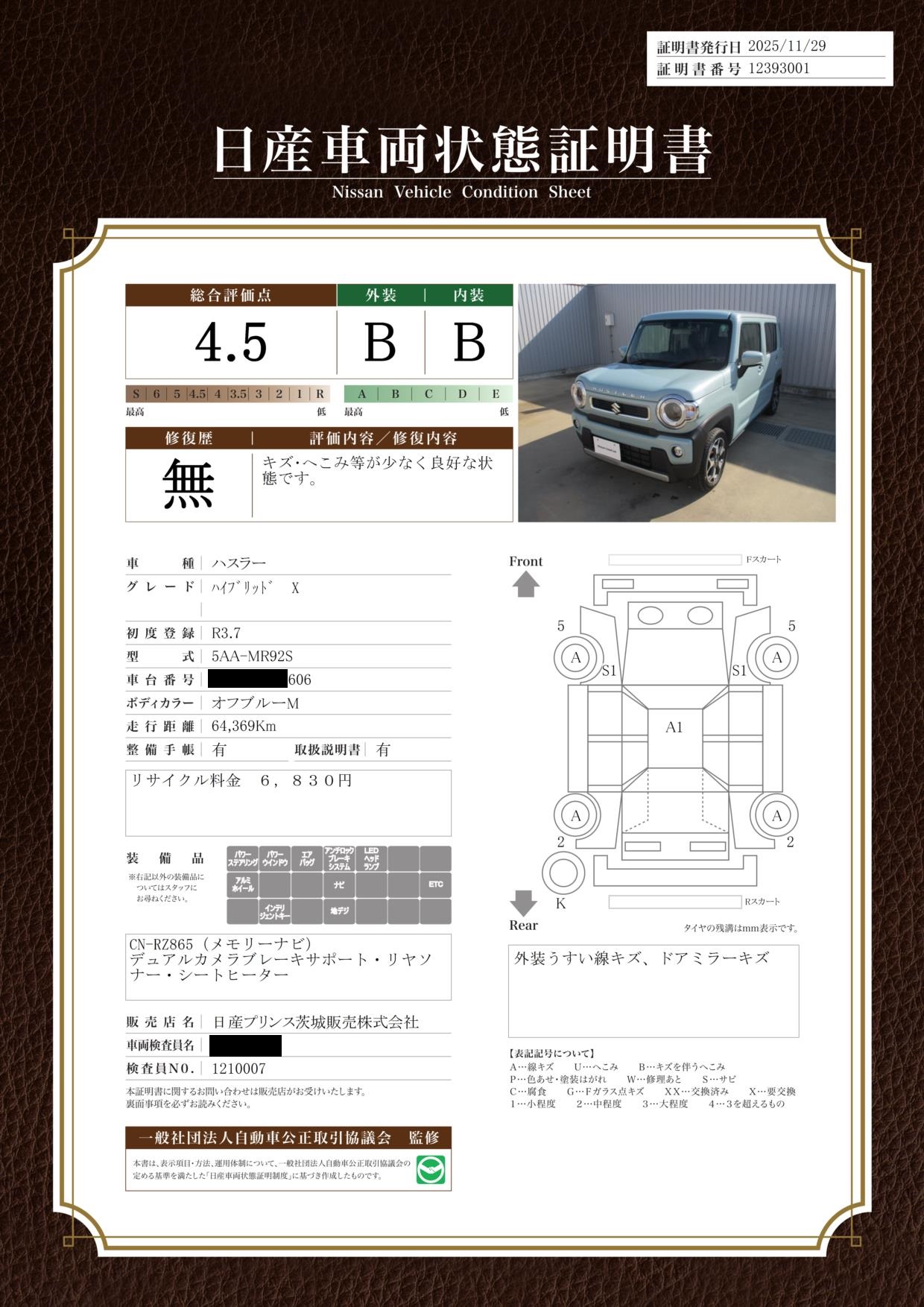 現状括弧書き内の年月まで車検有効期限が残っていますが、ご成約時に新しく車検を取り直します。なお取り直しの費用は車両価格に含まれています。
