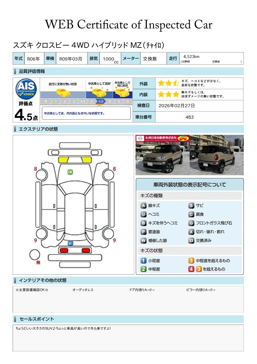 現状括弧書き内の年月まで車検有効期限が残っていますが、ご成約時に新しく車検を取り直します。なお取り直しの費用は車両価格に含まれています。