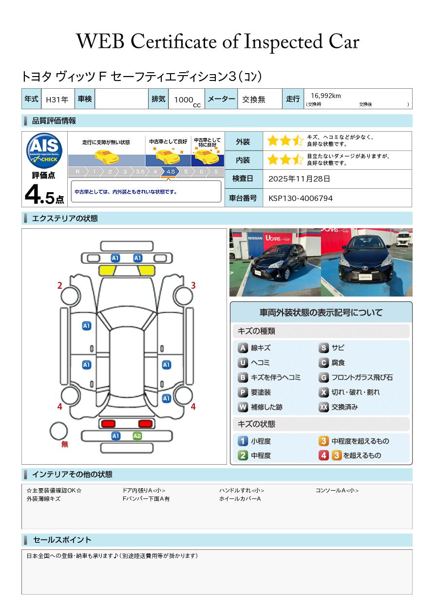 ヴィッツ 1000cc 1.0 F セーフティ エディションIII バックカメラ