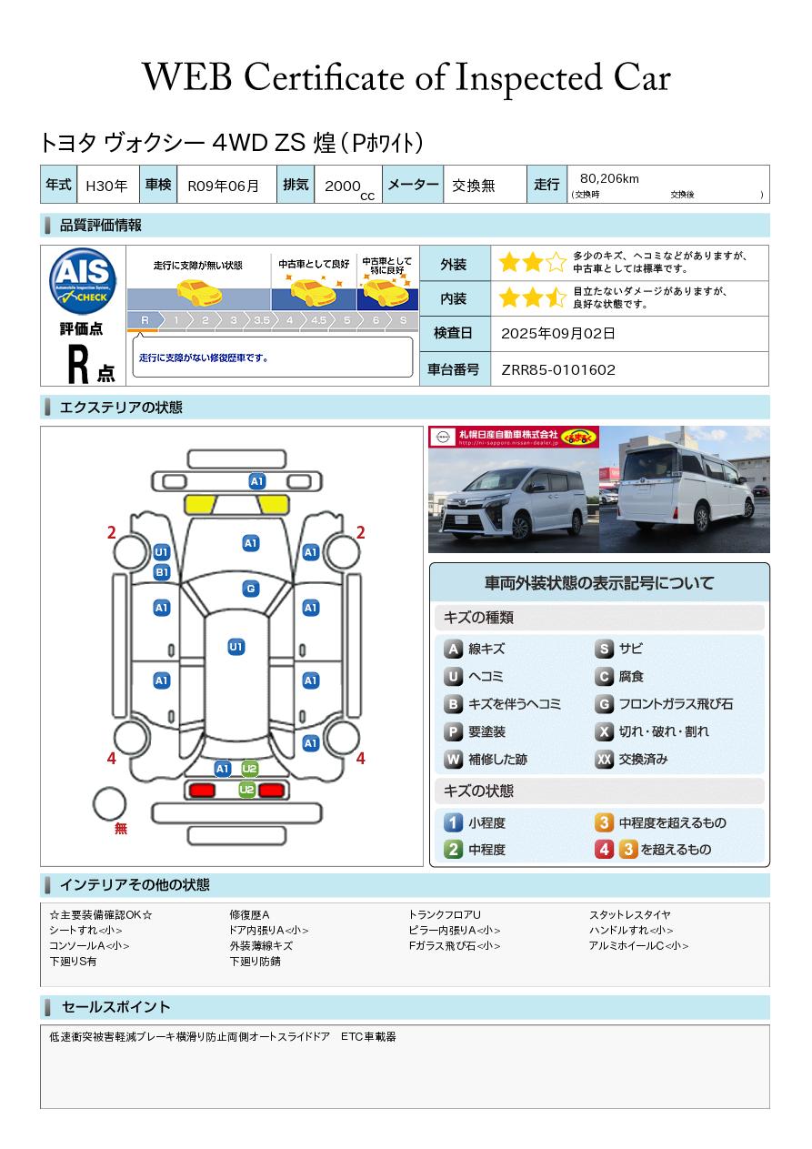 ヴォクシー 2000cc 2.0 ZS 煌 4WD 低速衝突被害軽減ブレーキ横滑り防止