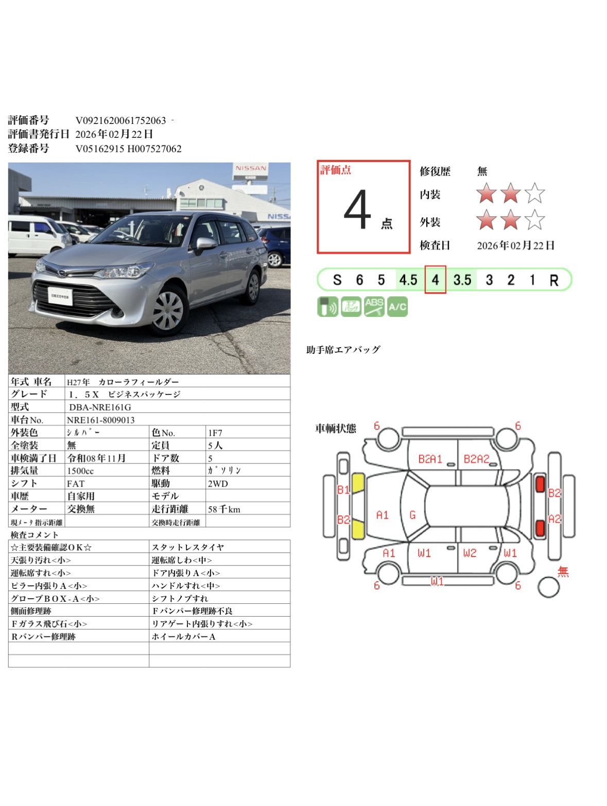 現状括弧書き内の年月まで車検有効期限が残っていますが、ご成約時に新しく車検を取り直します。なお取り直しの費用は車両価格に含まれています。