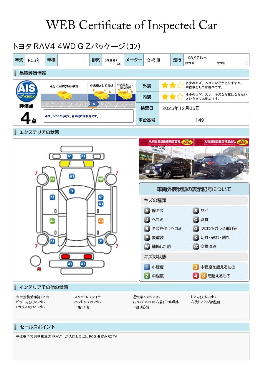先進安全技術搭載車の「RAV4」が入庫しました。PCS・BSM・RCTA・PKSB・LTA・TRC&VSC・9インチナビ・後席モニター