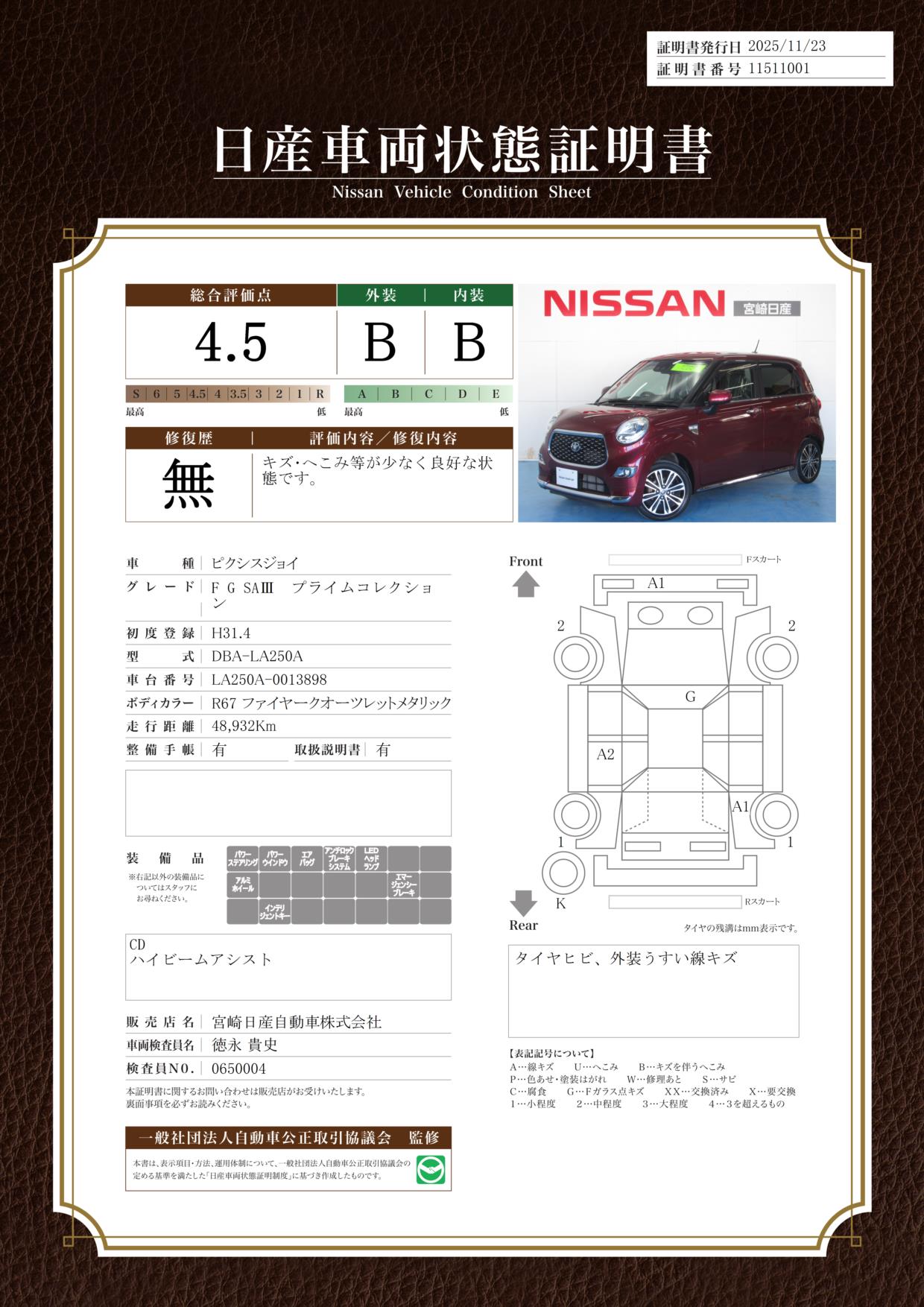 評価機関 : 日産車両状態証明