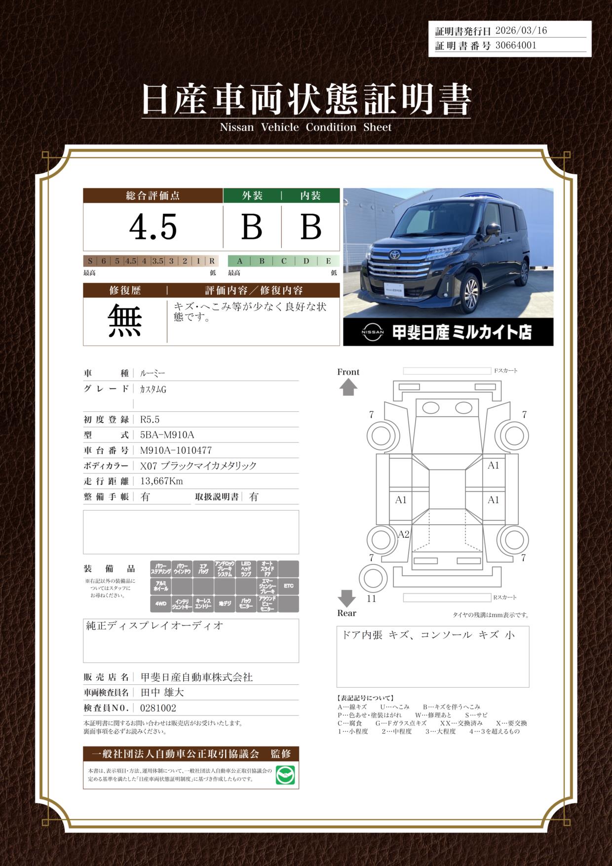 現状括弧書き内の年月まで車検有効期限が残っていますが、ご成約時に新しく車検を取り直します。なお取り直しの費用は車両価格に含まれています。