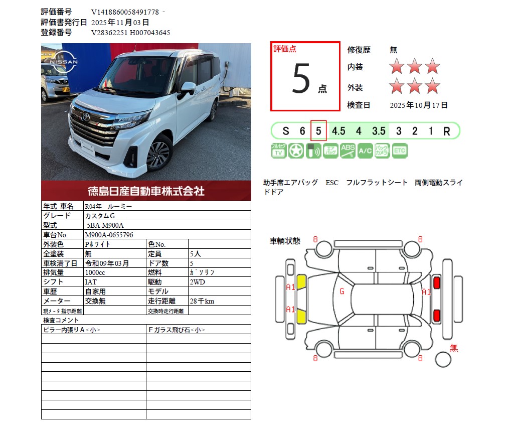 ルーミー 1000cc 1.0 カスタム G 禁煙車 全周囲カメラ 前後ドラレコ ETC 9イ